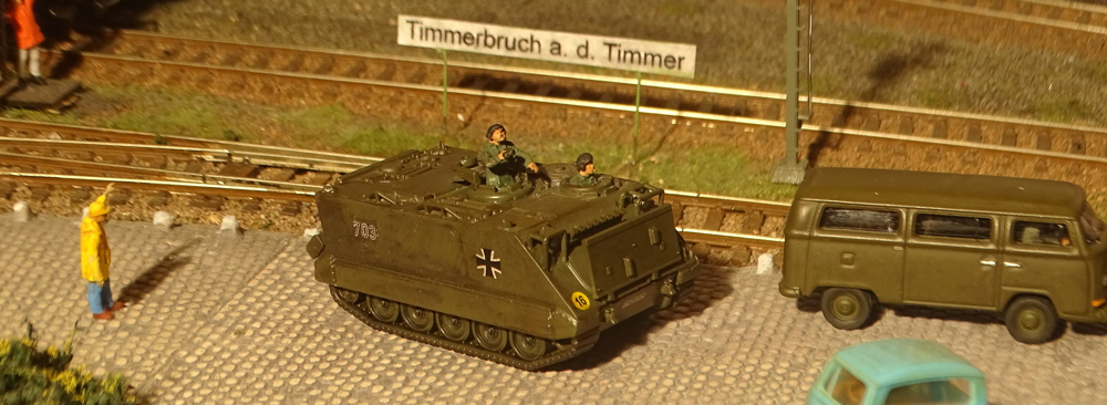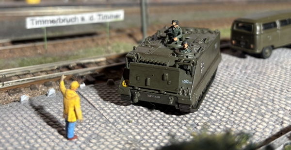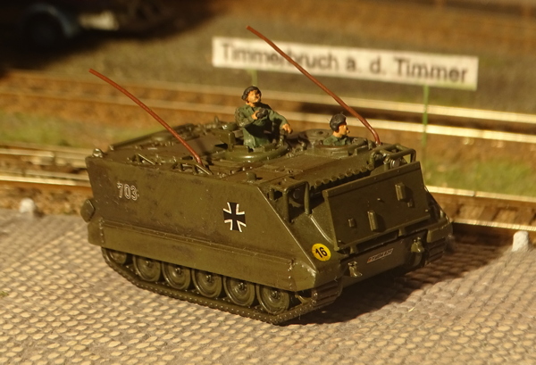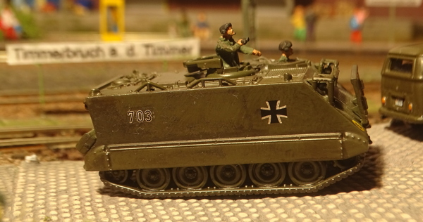Zum Modell: war eine üble Bastelei. Ich habe die beiden geschlossenen Luken einfach aufgebohrt und zwei kreisförmige Kunststoff-Teile aus der Bastelkiste dahinter geklebt als geöffnete Luken. Panzerfahrer-Figuren gibt´s ja von mehreren Firmen, der M113 selbst ist von Schuco und die neue Nummer stammt von Artitec (Turmnummern).