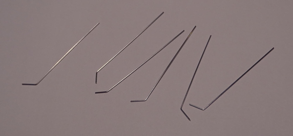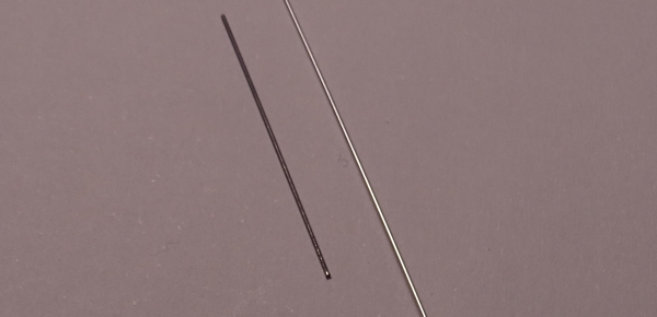Wo ich anfangs noch keine Idee hatte: die heruntergebundenen Antennen, wie kann man die sinnvoll nachbilden? Dünne Kupferdrähte aus Litzen wären durchmessermäßig ok, aber die sind nicht stabil genug. Da fehlte es lange am zündendenden Gedanken, denn die Antennen oben wirken mir einfach zu dick. Hilfe kam dann schnell aus dem HO-Modellbahnforum - sehr guter Voschlag von dort (DANKE Tom): Gitarrensaiten! Da gibt es viele verschiedene Dicken und die 0,3mm Saiten fand ich optimal, ein guter Kompromiss zwischen Handhabbarkeit und optischer Dicke. DENN: so dick wie auf dem Foto wirken sie auf der Modellbahn gar nicht. Auch der Glanz fällt dort gar nicht auf, der kommt auf dem Foto durch die 2.000-Watt-Sonne.