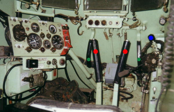 Und er hat mich einmal sogar beinahe umgebracht, der Sieben-Null-Drei! Nachtfahrt in einem Manöver, irgendwo zwischen Anröchte und Rüthen, Linkskurve. Um diese zu nehmen, muss die linke Kette etwas abgebremst werden. So werden Kettenfahrzeuge ja gelenkt, durch gezieltes Bremsen einer Kette. Als ich den linken Bremshebel anziehe, spüre ich keinen Widerstand. Er lässt sich bis zum Anschlag bewegen: Das Bremsband ist gerissen! Die linke Bremse ist defekt, damit lässt sich das Fahrzeug nicht mehr lenken - und auch nicht mehr bremsen! Wir rasen mit 60km/h auf den rechten Straßenrand zu, Bäume, dahinter Dunkelheit. Die mit dem roten Punkt markierten Hebel sind Lenkung und Bremse zugleich. Die Wendebremse habe ich mit einem grünen Punkt markiert und den Schaltknauf des Getriebes mit einem blauen Punkt.