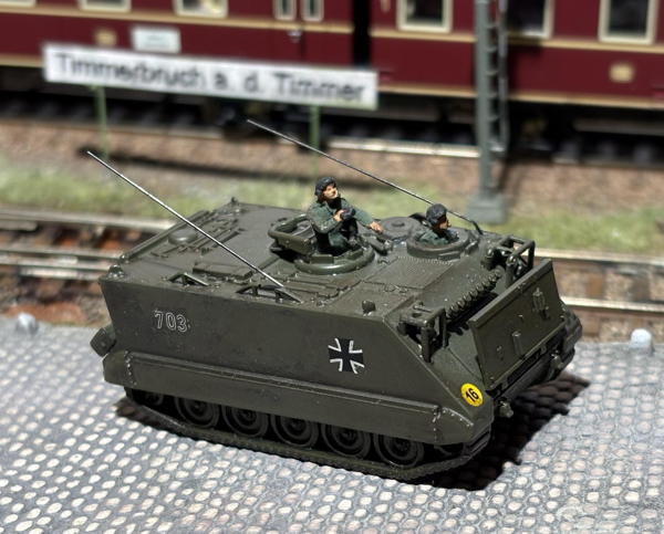 Zum Modell: war eine üble Bastelei. Ich habe die beiden geschlossenen Luken einfach aufgebohrt und zwei kreisförmige Kunststoff-Teile aus der Bastelkiste dahinter geklebt als geöffnete Luken. Panzerfahrer-Figuren gibt´s ja von mehreren Firmen, der M113 selbst ist von Schuco und die neue Nummer stammt von Artitec (Turmnummern).