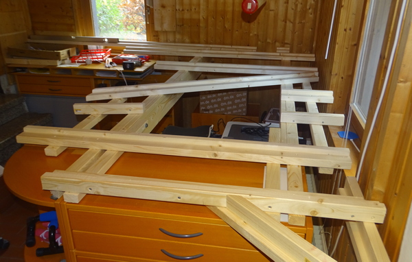 Der Unterbau besteht aus stabilen Kanthölzern, alle gehobelt und zu L-Leisten zusammengeschraubt und geklebt. Stabil ist mir wichtig, ich konnte auf dem Rohbau herumlaufen. Schon in den Siebzigern hatte ich den Unterbau meiner Anlagen mit dieser Technik realisiert! Auch Gewindestangen habe ich damals bereits genutzt.