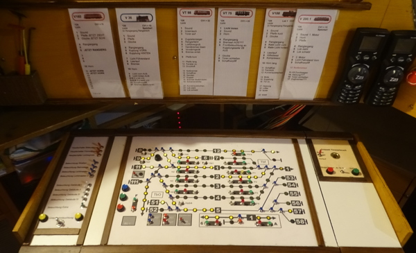 Über dem Stellpult links haben verschiedene Entkupplungsstangen ihr Zuhause, daneben ist Platz für die Lok-Karten - für jedes Triebfahrzeug existiert eine Karte mit der Belegung der Funktionstasten. Diese folgt nach Möglichkeit einer einheitlichen Grundbelegung (auf Taste 4 etwa liegt immer Rangiergang), aber es gibt natürlich Sonderfälle (und Decoder von Firmen, die jedes Mapping ihrer Kunden nur mit zusätzlicher kostenpflichtiger Software möglich machen, ein ganz lieber Gruß geht von hier nach Sonneberg).