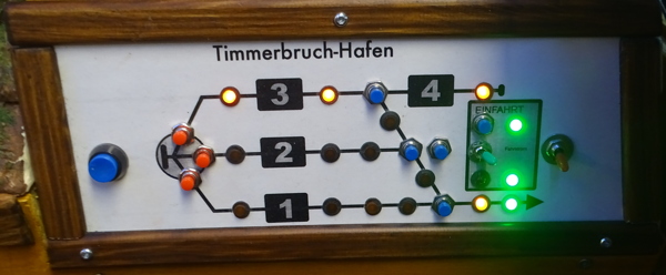 An mehreren Stellen gibt es kleine Zusatzschalter. Der Hafenbahnhof wird komplett vor Ort gesteuert. Durch LED-Leisten kann die Unterwelt beleuchtet werden, etwa für einen kurzen Blick in den Schattenbahnhof - gelbe Taster neben den diversen Öffnungen in der Verkleidung ermöglichen das von mehreren Stellen. Für das Schienenputzen oder Aufräumen nach Havarien kann diese Beleuchtung natürlich per Kippschalter auch auf Dauerlicht geschaltet werden.