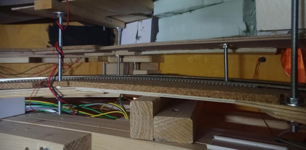 Gefahren wird mit 2-Leiter-Gleichstrom, die Fahrzeuge werden drahtlos digital gesteuert (Z21 inkl. WLAN-Router). Signale und ein Teil der Weichen werden mit guter alter Analogtechnik gestellt, die Weichen des Bahnhofs Timmerbruch über den CAN-Bus. Dieses Hybridsystem liegt in der Tatsache begründet, dass der Bau der Anlage eigentlich zeitlich ein Jahr später geplant war (hier hat Corona beschleunigend gewirkt) und ich mit dem Versuch, mich in die digitale Steuerung einzulesen, gerade erst begonnen hatte. Die 55 Weichen und etwa 90 Meter Gleise (ROCO, Mindestradius R3, mindestens 15°-Weichenwinkel, keine S-Kurven) liegen auf Buchensperrholz mit einer Schallisolierung aus Kork oder Moosgummi, die Streckenbretter werden durch Gewindestangen gehalten.