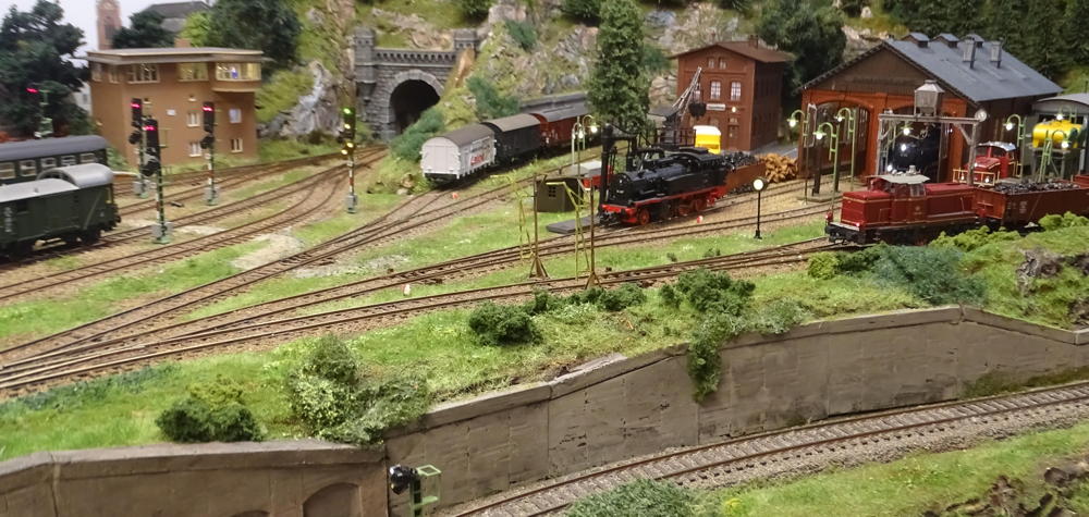 Grundsätzlich steht der Fahrbetrieb im Vordergrund. Fahren first. Dem hat sich alles andere unterzuordnen. So gibt es keine Bäume, Laternenmasten usw. im Vordergrund des Bahnhofes, optisch wäre das super, gäbe der Anlage mehr Tiefe - sie würden aber beim Entkuppeln und bei vielen anderen Gelegenheiten stören. Selbst Signale stehen nicht immer genau dort, wo sie beim Vorbild stehen würden. Darum sieht es zum Beispiel auf dem Bahnhofs-Plateau etwas kahl aus. Es gibt auch keinen automatischen Betrieb, es fährt in der Regel immer nur ein Zug, maximal gleichzeitig deren zwei. Damit auch fahrplanmäßiger Betrieb möglich ist, residiert eine große Bahnhofsuhr hoch über allem. Sie dreht ihre Runden je nach Lust auf Zeitdruck drei- bis fünfmal schneller als die Normaluhr und zeigt die TOZ, die Timmerbruch Orts Zeit. Und natürlich kann die Uhr jederzeit gestoppt werden - Stress muss nicht sein! Oder die Zeit läuft langsamer, etwa bei aufwändigen Rangiermanövern. Ich habe zu diesem Zwecke eine Tochteruhr auf eine entsprechende Steuerung umgebaut. In Timmerbruch jedenfalls ist der Fahrplan noch Gesetz, für seine Einhaltung drehen wir sogar an der Zeit! Aber, ganz ehrlich: es gibt auch seelige Zeiten sinnfreier Kreisfahrerei. Dabei ist durch einen ausgeklügelten Gleisplan ein abwechslungsreicher Verkehr in alle Richtungen möglich. Macht auch Spaß, vor allem meinen Enkeln.