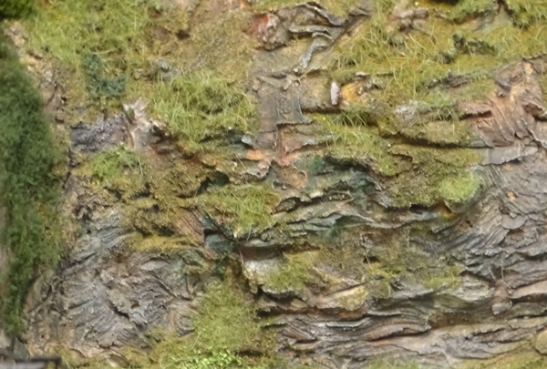 In der Regel sind die Felsen direkt in den Gips modelliert oder mit dem Pinsel und einem Spatel ins Toiletten-Papier gedrückt. Meist habe ich so eine Art waagerechte Schichtung versucht, irgendwie habe ich die Spachtelmasse oder den Gips auf felsig getrimmt. Bei waagerechten Flächen kann man dann später einfach kleine Grasinseln gestalten, nimmt den brutalen Gesteinen ein wenig die furchteinflößende und bedrohliche Wirkung.