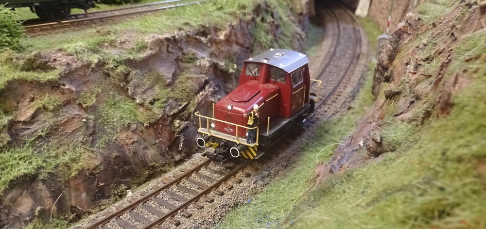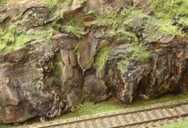 Ja, ganz ehrlich: da hatte ich schon Manschetten. WIE zum Teufel sollte ich natürliche Felsen machen? Denn die gibt es zu Hauf, ganz klar. Habe ich ja schon beschrieben, warum bei Modellbahnanlagen in der Regel Mittelgebirgslandschaften nachgebildet werden, warum man Tunnel, Stützmauern, steile Böschungen und natürlich Felsen braucht. Auf manchen Anlagen wird hier sehr vorbildnah gearbeitet, es werden sogar unterschiedliche Gesteinsarten nachgebildet, natürlich in der typischen Formation. War mir alles zu umständlich. Am Ende habe ich auch hier beschlossen, mich auf das Grundsätzliche zu beschränken: ein Fels ist ein Fels ist ein Fels - und fertig. Die Natur bietet ein derartiges Spektrum an Formen und Farben - eigentlich kann man nichts falsch machen. Und wenn wirklich mal ein/e Geolog:in zum Spielen kommt und hier gewisse Unstimmigkeiten reklamieren sollte - es ist kein geologischer Lehrpark, Anregungen sind immer willkommen - im nächsten Leben werde ich sie dann umsetzen. Und meckernde Geologen m/w/d bekommen einfach eine knifflige Rangieraufgabe, da kommt er/sie/es auf andere Gedanken.