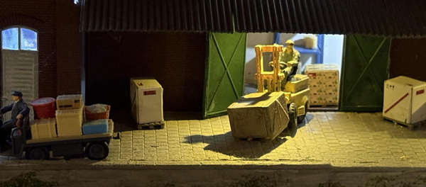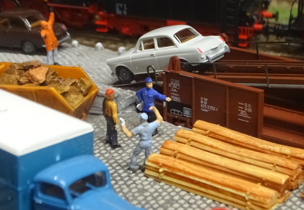 Auch die Szene mit den hart arbeitenden Männern im Hafen gehört in diese Reihe. Allerdings: die Gleisarbeiter-Rotte hat letztlich eine Alibi-Funktion, denn da ich die Schwenkbühne analog bediene, kann sie nur zwei Punkte anfahren. Der mittlere Gleisanschluss ist also mit der Segment-Drehscheibe nicht zu bedienen - blöd für die Bahnmenschen, denn nun müssen sie im ohnehin viel zu kleinen Hafenbahnhof sehen, wie sie ohne dieses Umfahrgleis klar kommen.