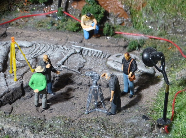Hier und da hat es eben dann doch richtig Spaß gemacht, etwa mehr ins Detail zu gehen. So wird an der Saurier-Ausgrabung - Idee meiner Enkel - gerade der Indiana Jones von Timmerbruch interviewt. Wer macht das Interview? Hagen von Ortloff, der gebürtige Zwickauer mit der imposanten Stirnpartie wurde bekannt durch seine legendären Eisenbahn-Filme.