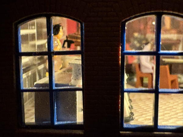 Es gibt eine Bar, links, sogar mit Zapfanlage und Zapfhähnen, die selbst mit meiner feinsten Pinzette kaum zu greifen waren. Eigentlich wollte ich da noch den legendären Steinway-Flügel einbauen, der war leider gerade nicht lieferbar (gibt´s tatsächlich) - aber ich werde drauf verzichten. Man sieht es von außen nicht wirklich. Was man erkennt, ist angedeutetes Leben. Dazu trägt auch die warme Beleuchtung bei, die bei der eher kalten Lichtstimmung im Umfeld sofort ins Auge fällt. Ich habe Barhocker zusammengeklebt, Reagle aufgestellt, Gläser auf die Theke geklebt...