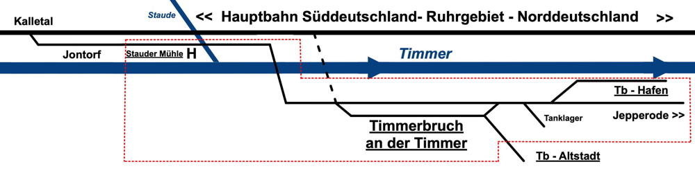 *Nur der rot umrandete Bereich ist auf der Anlage zu finden! Bahnhof Timmerbruch mit Abzweig nach Tb-Altstadt, mit Gleisanschluss Tanklager und den abgehenden Strecken nach Jepperode und nach Jontorf, letzterer mit Fischbauträgerbrücke über der Timmer und dem Haltepunkt Stauder Mühle. Ein 7- bis 13 gleisiger Abstellbahnhof (6-gleisiges Zusatzmodul) nimmt die Aufgaben der anderen Bahnhöfe wahr, der Hafenbahnhof kann als weiteres Zusatzmodul angesetzt werden.