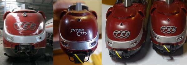 ...mit TEE-Symbol - Foto links - und so - rechts - sehen sie jetzt aus. Das Symbol habe ich nach Hinweis im Forum in der ROCO-Ersatzteilliste gefunden und gegen den aufgesteckten Intercity-Schriftzug getauscht. Doch nun zurück nach Timmebruch!