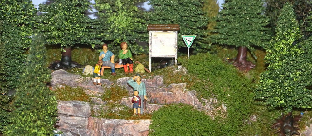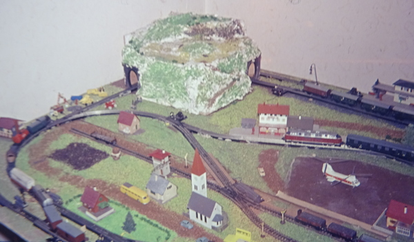 Landschaft? Na klar gibt´s auch Landschaft! Selbst die hat heute eine ganz andere Qualität als 1960 - damals streute man einfach gefärbtes Sägemehl auf den Gips. Fertig! Damit der nicht weiß durchleuchtete, habe ich den Gips später immerhin schon mit braunem Pulver angefärbt. Heute werden Grasfasern verschiedener Längen und Farben elektrostatisch "aufgeschossen" auf einen vorher mit vielen verschiedenen Materialien gestalteten Boden. Sieht wirklich aus wie eine Wiese, wie ein Waldboden, wie ein verwildertes Unkrautfeld. Toll!