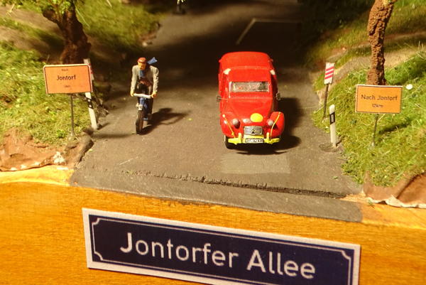 Der Rand von Modul IV - meine alte Ente überholt hier gerade einen Radfahrer, der etwas langsamer ist als der 23-PS-Bolide. Von hier führt die Jontorfer Allee nach Jontorf - huch, ich habe zwei verschiedene Ortsausgangsschilder montiert - muss ich noch ändern.