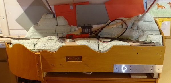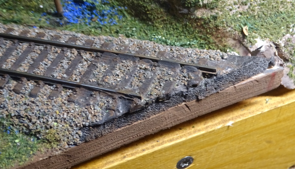 Die schwarze Masse habe ich als Skipper genutzt, damit kann im Prinzip ALLES mit ALLEM verklebt werden, und zwar zuverlässig. Nach dem Aushärten entsteht so eine bombenfeste Verbindung des Gleises mit dem Untergrund. Und bisher klappt es mit den Übergängen auch hervorragend. Wobei ich mir zuletzt immer ein bisschen Spielraum eingebaut habe, die Möglichkeit, für die letzten Hundertstel-Millimeter doch noch etwas Raum zum Justieren zu haben. Einziges Problem sind die empfindlichen Gleis-Enden. Sie liegen ja direkt am Rand, MÜSSEN direkt am Rand liegen und bereits zweimal waren die Profile an einer Stelle durch Stoß oder sonstige unsanfte Berührung aus den Kunststoff-Halterungen an den Schwellen herausgerutscht. Zwar ließ sich das mit Sekundenkleber schnell und korrekt reparieren, aber da muss ich mir noch etwas einfallen lassen. Auf jeden Fall geht es jetzt beim Andocken zu wie bei den Igeln beim Sex: sehr vorsichtig!