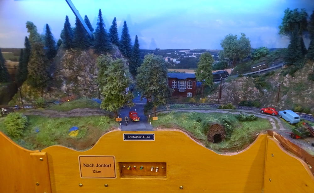 Auch ein anderes Problem musste erstmals gelöst werden: WO endet eine Straße, vor allem: WIE endet sie? Man kann ja schlecht eine Straße stumpf vor der Hintergrundkulisse "abschneiden" - sie braucht doch eine Perspektive! Die Jontorfer Allee jedenfalls habe ich in einem Gefälle enden lassen, sie läuft den Berg hoch und über eine Kuppe geht´s dann wieder zu Tal. Niemand sieht das Ende der Allee - und die Fahrzeuge keuchen die Steigung hoch. Da reicht dann als Kulisse etwas Himmel.