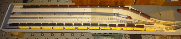 *Irgendwie hat es mich dann doch gestört - der Schattenbahnhof war einfach zu klein für den ständig wachsenden Fahrzeugpark. Vor allem die langen Ganzzüge ließen sich nirgendwo unterbringen, es konnte immer nur einer aufgegleist sein - und das war blöd wenn wir richtig Fahrbetrieb gemacht haben. Also entstand das 8. Modul, einen einfacher Schattenbahnhof mit sieben langen Stumpfgleisen, der statt des Hafens angeschlossen werden kann. Das dauert etwa 10 Minuten, weil er in den Flur ragt und daher gut stabilisiert werden muss. Sollte mal jemand aus Versehen daran stoßen - er bewegt sich nicht. Viel mehr gibt es darüber eigentlich nicht zu sagen, darum gibt´s zu diesem Segment keine großen Worte. Vielleicht noch eines: da nun absolut nirgendwo mehr Platz war für die Unterbringung des 2,7m langen Trums habe ich das Teil unter die Decke gehängt, da stört es nicht.