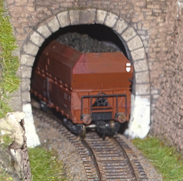 Aber dann kamen die Selbstentladewagen. Natürlich wollte ich einen solchen Zug auf der Anlage haben und als auf einer Modellbahnbörse fünf Wagen zu einem guten Kurs angeboten wurden, habe ich die sofort gekauft. Obwohl die Verpackung schon älteren Datums war und die Wagen von Fleischmann waren. Denn während es bei normalen Tunnelportalen keine Probleme gab...