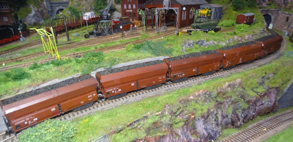 Vielleicht war nur die Beladung zu hoch, denn mit Kohlen oder Koks konnten die Wagen ja sehr hoch beladen werden, anders als mit Erz - da war wegen der höheren Dichte ja von außen nichts vom Inhalt der Wagen zu sehen. Vielleicht stammmten die Wagen aber auch noch aus der 1:82 oder 1:85-Zeit der Fleischmänner - mit den später angeschafften BRAWA-Wagen gab es jedenfalls keine Probleme. Wie dem auch sei: diese Wagen kamen nicht durch die Überwerfung und ich habe mich dann schweren Herzens wieder von ihnen getrennt. Aber es kam noch dicker!