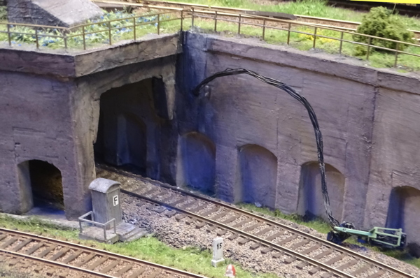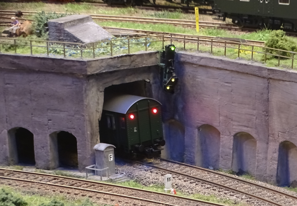 Als ich dann an die Signale ging, musste hier natürlich der klassische Signalkorb hin. Zu der Zeit nirgendwo lieferbar, also habe ich einfach eines der Viessmann-Signale kastriert und nur den oberen Teil an die Wand gebaut - Hauptsignal mit Vorsignal darunter. Während der Signalkorb des Vorsignals beim unteren Portal durch den Mauerbogen weit zurück lag, ragte es beim oberen Portal doch verdammt weit in Richtung Gleis.